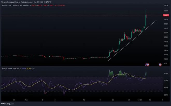 本周,比特币现金经历了超过 113% 的惊人飙升。今天,山寨币达到了 305.64 美元的显着峰值。截至发稿,BCH 交易价格为 300.90 美元,日涨幅为 31.8%。