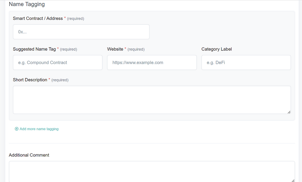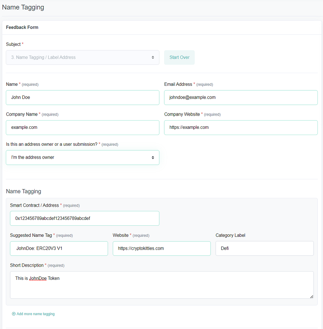 4. 在Name Tagging名称标记下填写所有必要信息。请注意,您可以单击Add more name tagging,在同一表单上添加更多合约。所有字段都是必填项!