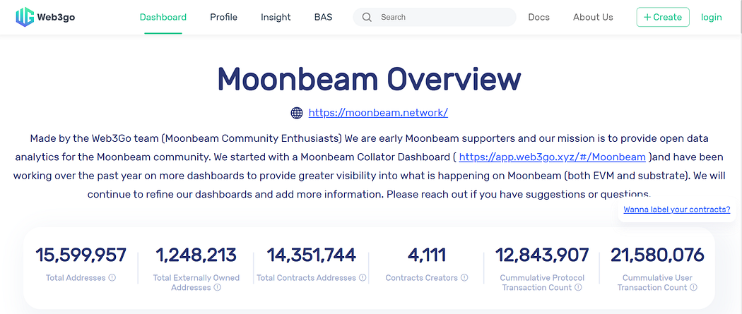 如果您正在自建数据面板检测应用活跃度、使用情况等指标,不妨先给项目的智能合约打上标签,这有助于浏览器和第三方链上分析工具精准检测您的项目链上活动,提升数据面板的数据准确度,并且深入了解Dapp在Moonbeam网络中的使用情况。