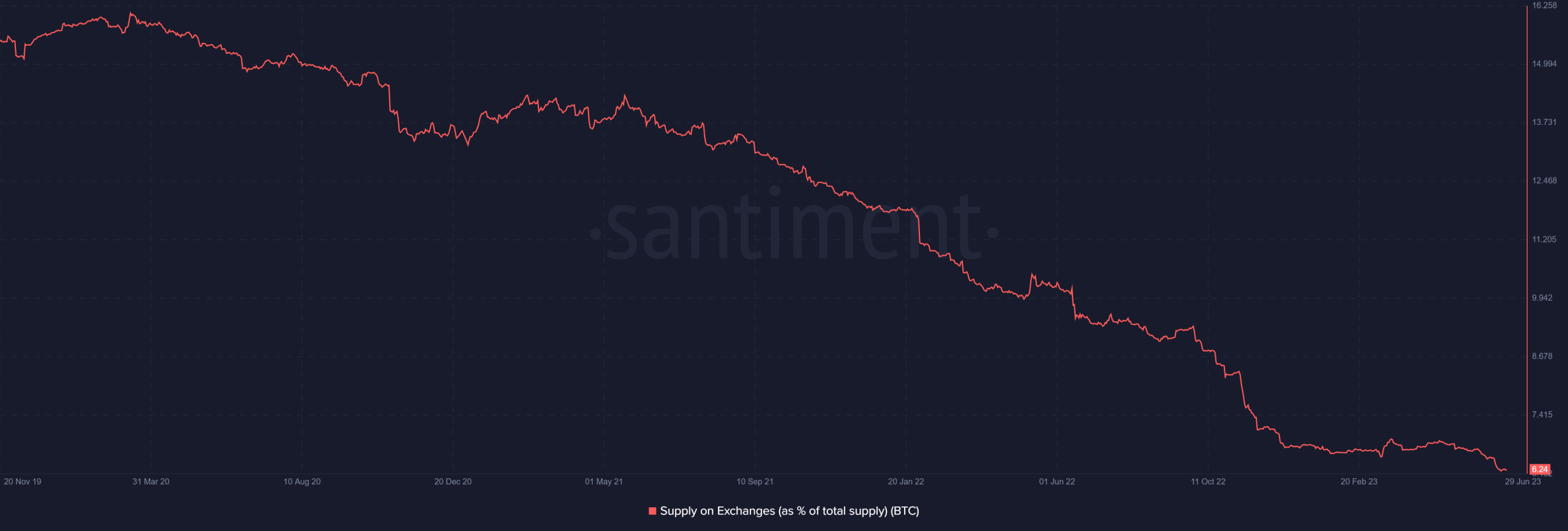此外,交易所比特币供应量的减少进一步证明了该资产的非流动性。据 Santiment 称,截至撰写本文时,当前供应量约为 6.24。该标准表明,尽管个人和机构持续积累,但没有出售或大量供应涌入市场的迹象。