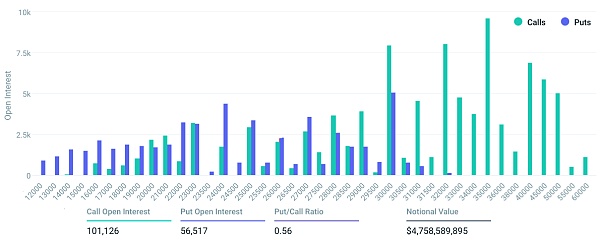 30,000 美元至 31,000 美元之间: 1,500 个看涨期权与 2,100 个看跌期权。最终结果有利于看涨工具 4.4 亿美元。