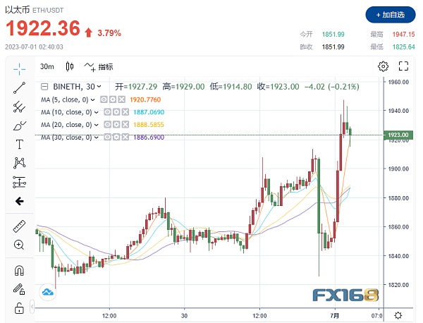 以太坊日内涨超5.00%,现报1942美元/枚。