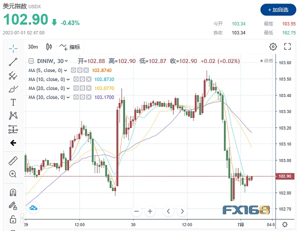美元指数一度下跌超0.5%,至102.75低点,较日高回落80点。