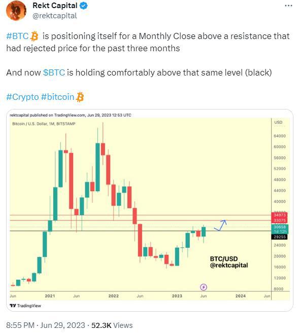 与此同时,受欢迎的交易员和分析师Rekt Capital在6月30日月度蜡烛图收盘前的月度时间框架上,也看到了同样有希望的迹象。