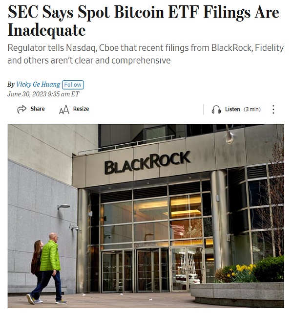 知情人士说,SEC告知代表贝莱德(BlackRock)和富达投资(Fidelity Investments)等资产管理公司提交申请的纳斯达克和芝加哥期权交易所(Cboe),这些申请不够清晰和全面。