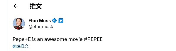 狗狗币DOGE支持者、特斯拉首席执行官Elon Musk在社交媒体发文“Pepe+E is an awesome movie #PEPEE”(Pepe+E是一部很棒的电影#PEPEE),或暗示PEPEE为PEPE 2.0版本,PEPEE会是一场很奇妙的电影情节,前景闪亮。目前,多个加密社区账号在该推文下留言。
