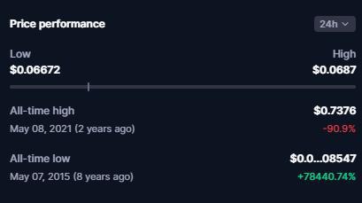 DOGE 的交易价格为 0.06718 美元,过去 24 小时内价值下跌 1%。根据 CoinMarketCap数据,meme 币为其早期投资者提供了 78440% 的投资回报率。DOGE 于 2021 年 5 月 8 日触及历史高点 0.7376 美元。最大的 meme 代币较历史高点下跌了 90.9%。