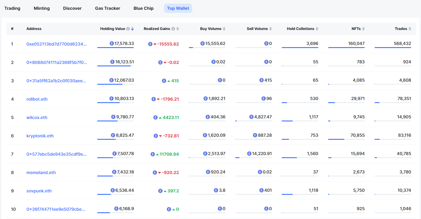 NFTScan 对排名前 1000 的 NFT 持仓价值钱包地址进行了分析,当前持有价值排名前 10 如下图所示:Top1 钱包:0xe052113bd7d7700d623414a0a4585bcae754e9d5