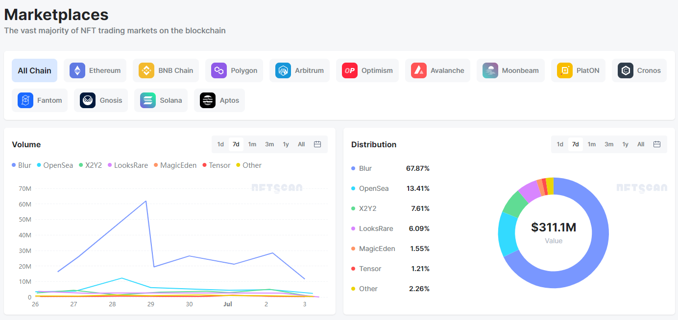 本周:大部分交易市场走势较起伏,由于 AzukiElementals 的发售,整体交易额在 28 日达到最高,7d 总交易额 $311.1m 较上一周($212.4m)有近 $100m 的上升,Blur 占比 67.87% 占市场约 7 成。排名前六的交易市场及占比分布: