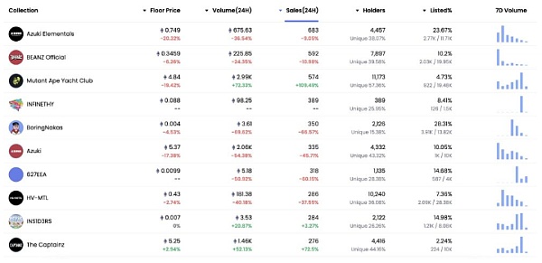 截至发稿,Azuki、Elementals、BEANZ的价格在过去24小时内分别下跌了13.35%、19.59%、5.9%。近7天的跌幅更为可观,跌幅分别为62.54%、61%、70.76%。