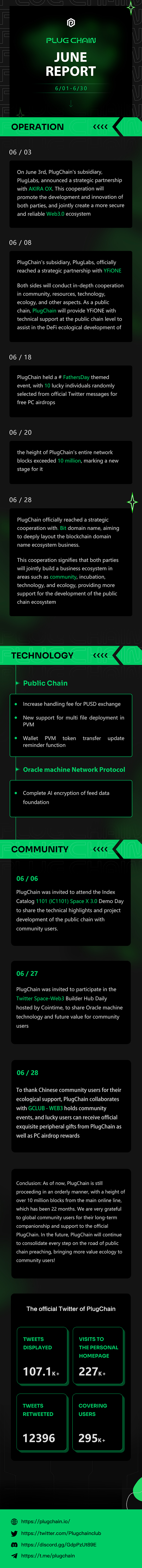大家好,今天我们推出PlugChain 6月份的月报,接下来我们看看6月的PlugChain都有什么新的进展吧!