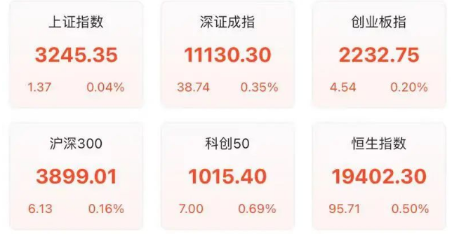 截至收盘,沪指涨0.04%,报收3245.35点;深成指涨0.35%,报收11130.30点;创业板指涨0.2%,报收2232.75点;沪深300涨0.16%,报收3899.01点。