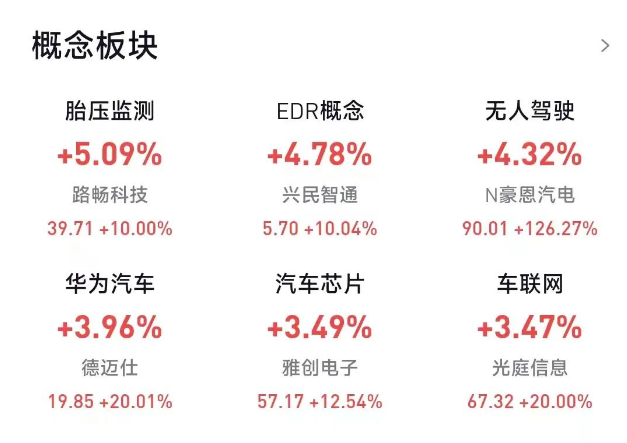 这几天新能源的热点还在延续,已经从电池、整车延续到智能驾驶板块。无人驾驶、胎压监测、车联网、毫米波雷达等概念纷纷大涨。