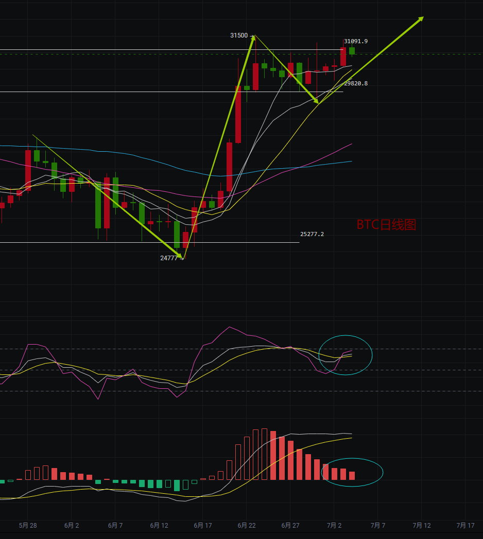 上文在7月2日给出的BTC:30180--29850多,成功在7月2日晚间激活,行情最低触及30149一线后反弹,最高触及31400一线,短线有1200点以上的利润空间