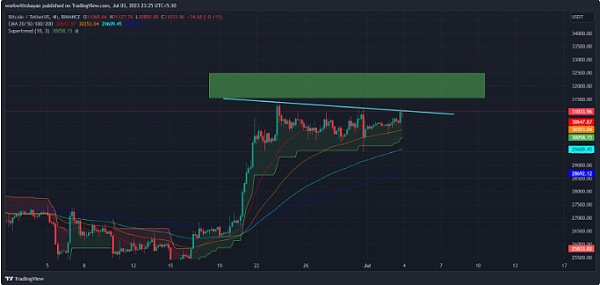 比特币交易价格仍接近 31,000 美元的重要阻力位,这表明投资者并不急于实现利润,因为他们预计比特币会进一步上涨。截至撰写本文时,BTC 价格交易至 31,032 美元,在过去 24 小时内飙升超过 1.8%。