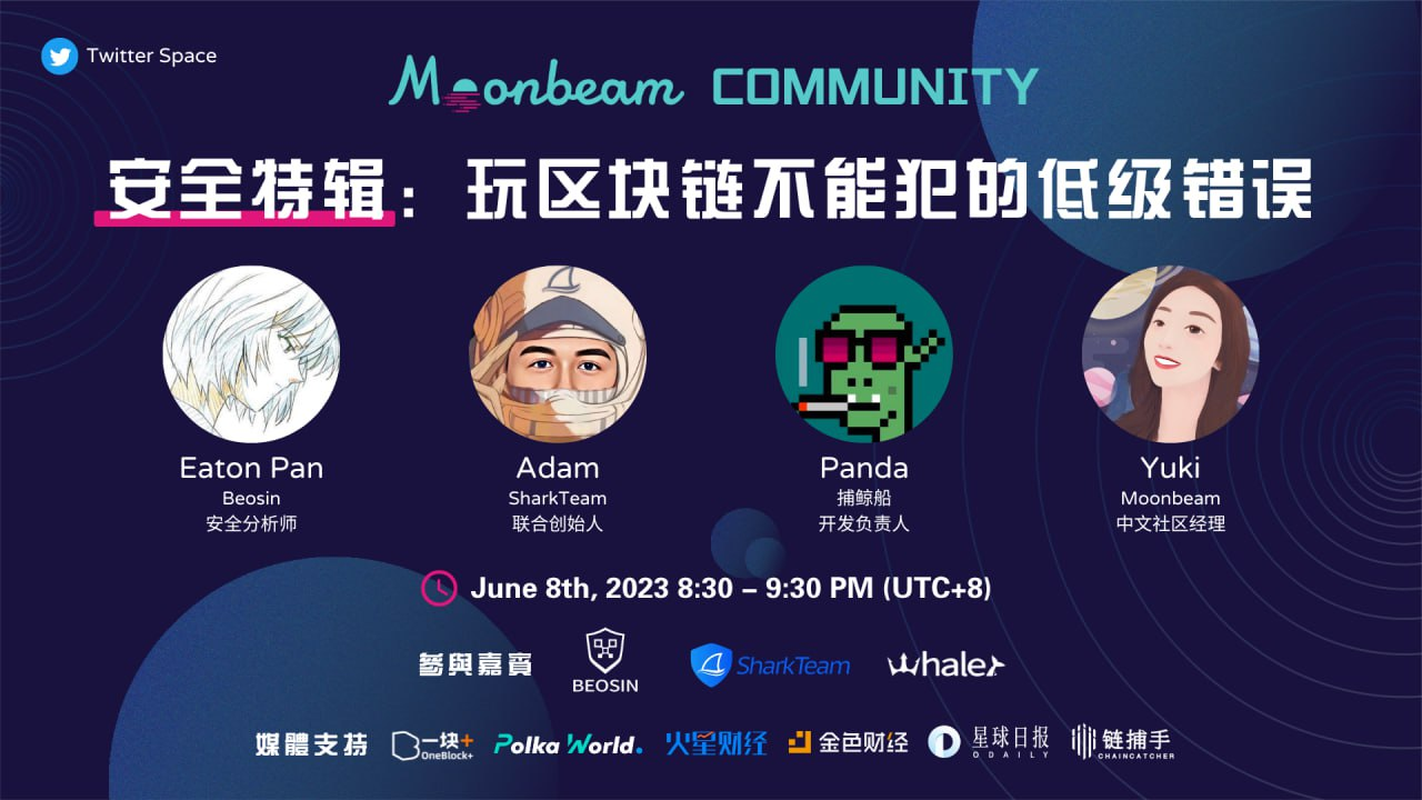 Beosin安全分析师Eaton Pan、SharkTeam联合创始人Adam、捕鲸船开发负责人Panda做客Moonbeam社区,针对安全这一话题,共同探讨了玩区块链不能犯的低级错误,并分享了亲测好用的安全插件。