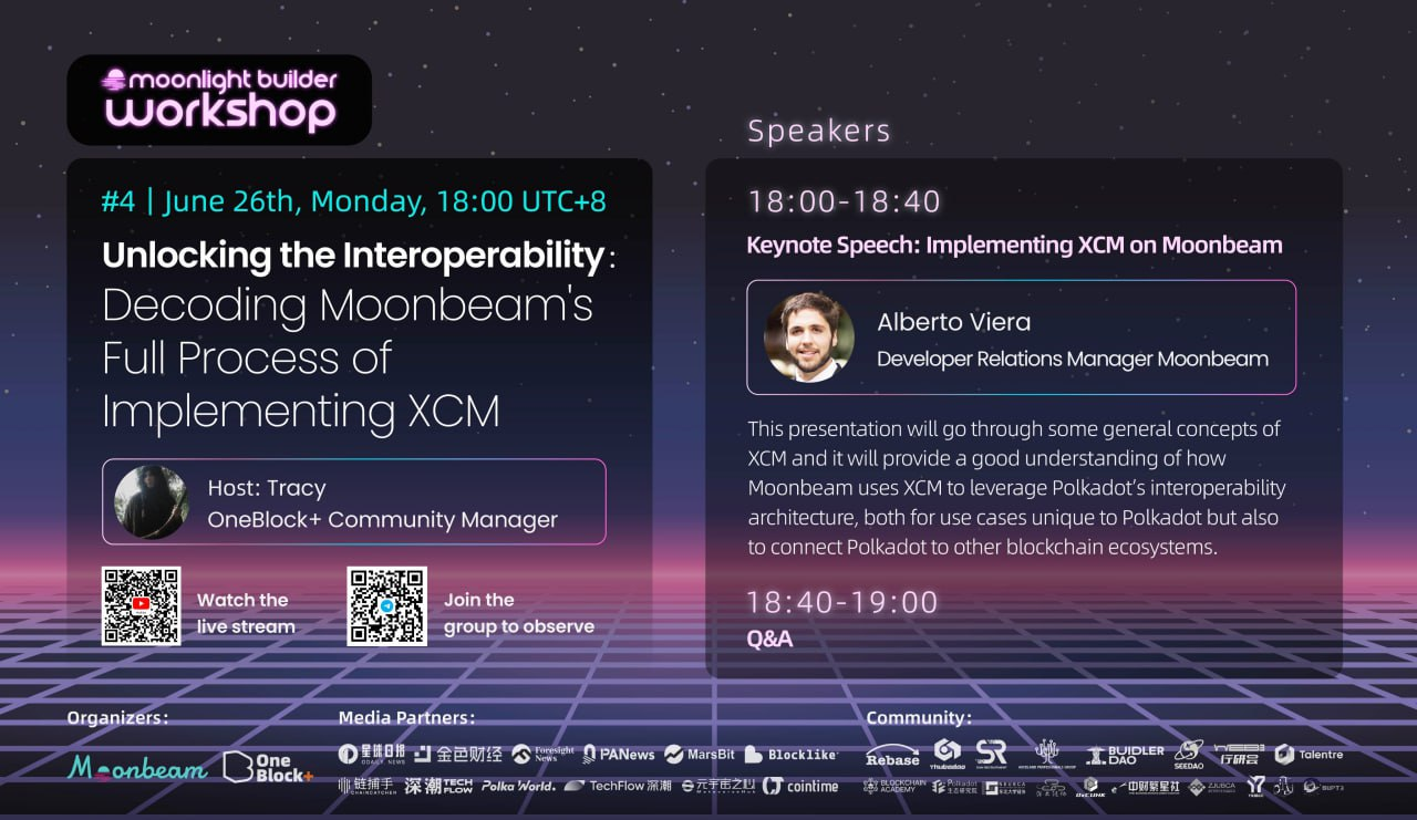 本次活动由OneBlock+社区经理Tracy主持,Moonbeam开发者关系经理Alberto作为嘉宾发表演讲,为大家详细介绍了XCM的一些基本概念,以及在Moonbeam上如何用XCM来发挥Polkadot的互操作性架构的作用,将Polkadot与其他区块链生态系统连接起来。