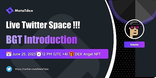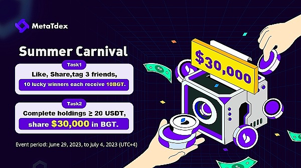 BGT项目在MetaTdex社区送价值30000BGT空投。MetaTdex平台国际用户钱包资产超过20美元,即可瓜分奖池。社交媒体品牌海报传播者,还有机会获得10BGT额外奖励。