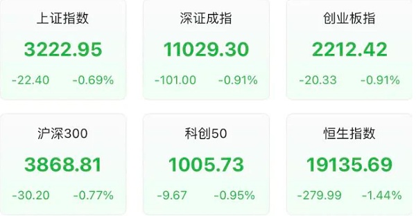 截至收盘,沪指跌0.69%,报收3222.95点;深成指跌0.91%,报收11029.30点;创业板指跌0.91%,报收2212.42点;沪深300跌0.77%,报收3868.81点。