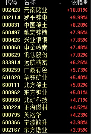 有色金属股早间逆市放量走高,板块指数盘中一度涨逾2%,创近2个月来新高,半日成交超昨日全天成交。云南锗业连续第2日开盘涨停,股价创1年多来新高;中金岭南、罗平锌电、丰华股份等盘中均直线拉升快速涨停。