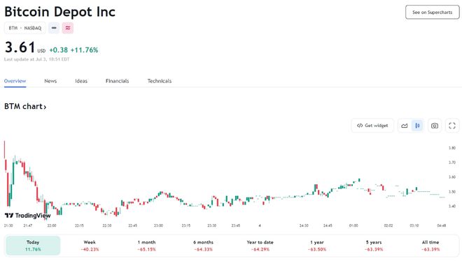 Bitcoin Depot通过SPAC公司GSRII Meteora合并,周一在纳斯达克借壳上市,交易代码为BTM。BTM股价在首日盘前交易中一度上涨至6.60美元,随后回落至3.39美元,周二收市报在3.61美元,录得11.76%的升幅。
