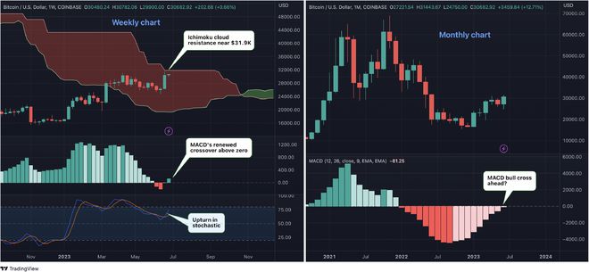 技术分析研究提供商Fairlead Strategies分析师在给客户的报告中写道:“比特币正在盘整阶段消化其升幅,看涨的牛市旗形可能正在形成,并将在突破每周云线(Ichimoku)附近31900美元时完成。”