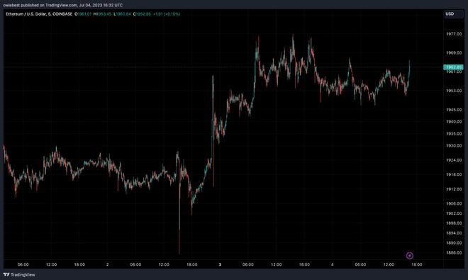 以太坊本身并没有经历最好的日子,因为其交易量较周一大幅下降。目前为 60 亿美元,比周一的数字下降 27%。尽管如此,其价格仍保持稳定,微幅上涨 0.1%,交易价格为 1,963 美元。