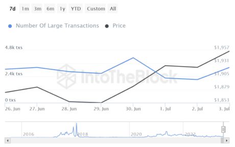 IntoTheBlock数据显示,ETH 鲸鱼的交易数量在几天内增加了一倍。这一增长使他们的总交易量在两天内从 2,120 笔增加到 3,230 笔。交易数量的激增意味着从 7 月 2 日到 7 月 4 日的短短 48 小时内增长了 54% 以上。在 7 天的时间里,ETH 鲸鱼转移了近 200 亿美元。