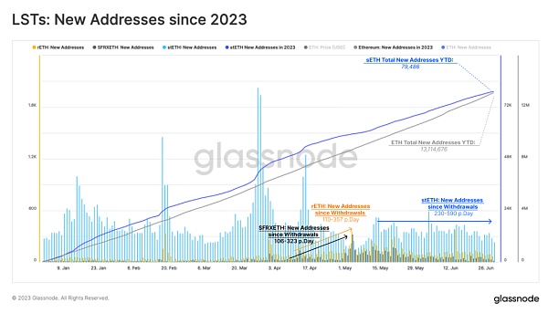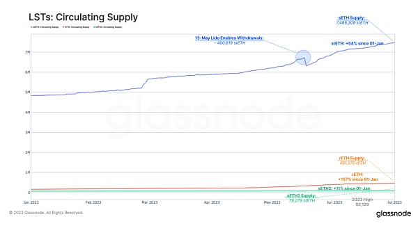 以太坊上海升级在4月中旬完成,参与者能够对质押的ETH进行提款。与其说是催生了一波提款潮,不如说是进一步加速了质押存款活动的进行,市场对流动性质押衍生品LSD表现出了明显的偏好。