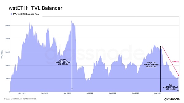 通过对Balancer的wstETH-ETH Pool的分析,我们可以看到这种趋势更加明显。自4月15日以来,该Pool的TVL下降了71%:从3.512亿美元减少到1.014亿美元。