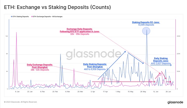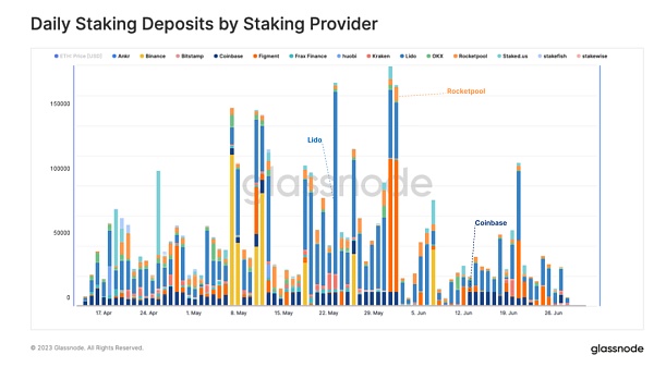 质押活动(交易数)在6月2日达到高峰——新的质押超过13,595笔(价值超过40万ETH)。我们可以将其与交易平台中的ETH交易量进行比较,在此期间,交易平台的ETH交易量一直保持在3万左右。