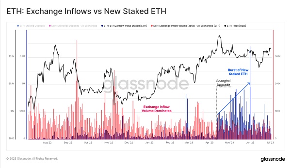 如果我们比较一下交易平台上ETH的质押量(蓝色)与ETH的流入量(红色),就可以清晰的看到新质押的ETH数量正在迅速攀升。自上海升级以来,ETH质押活动一直保持高速增长,与交易平台的流入量旗鼓相当。