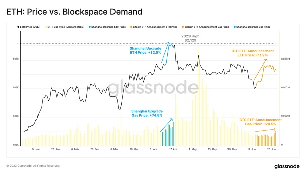 从年初至今,ETH价格的上涨还没有引起链上活动的波动。代表区块空间需求的Gas费一直保持在相对较低的水平,尤其是在ETF申报公告之后的一周。在4月份上海升级期间,也就是ETH市场出现类似反弹之前,Gas费上涨了78%,而本周的涨幅为28%。