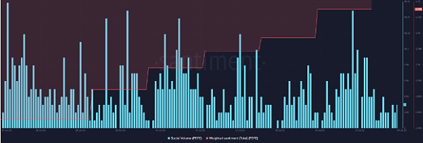与指标的重置一样,memecoin 的社交量保持稳定,反映了它在加密社区的受欢迎程度。市场上围绕 PEPE 的积极情绪也占主导地位,从其权重情绪的上升就可以看出这一点。