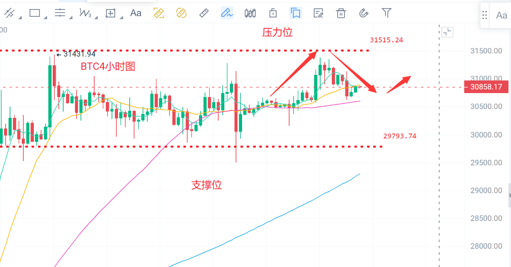 大饼重回30000后,在高位震荡了13天之久,多次上攻均失败,短线回踩30600未跌破,说明还是有一定的强度,短线维持强势震荡,在没有走出区间时,可以高抛低吸,一旦有效突破区间,将会出现较大波动。