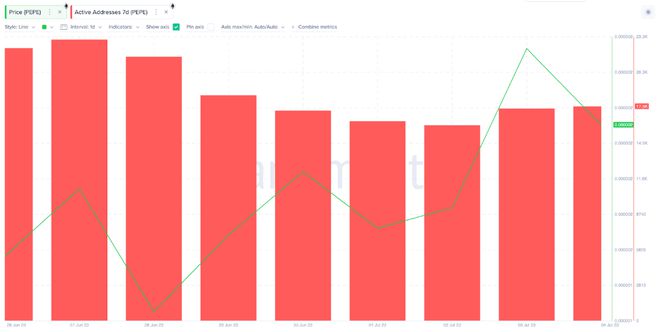 如下图所示,6 月 28 日至 7 月 4 日期间,PEPE 价格上涨了 16%。但是,对 PEPE每日活跃地址数据的更深入分析显示,用户活动放缓了 24%。
