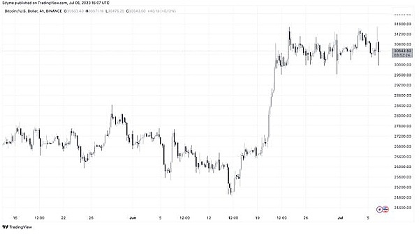 BTC 的交易价格在 30,000 美元以上,继上个月跌破该水平后有所回升。该资产的低迷很大程度上是由于美国证券交易委员会(SEC)对币安和 Coinbase 这两个最重要的加密货币交易所发起的法律挑战所致。