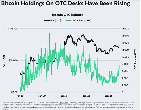 我们认为,场外交易柜台余额的增加表明机构和其他大型资本配置者越来越关注比特币。