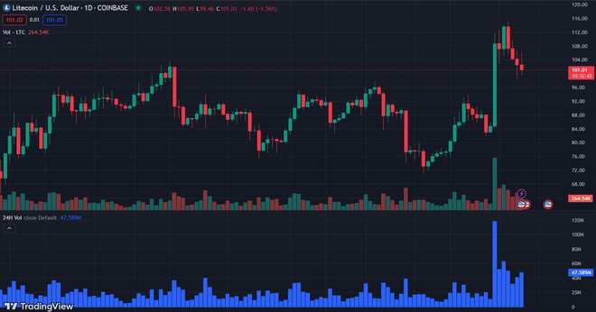 由于莱特币的价格走势在同一天飙升了约28% ,因此交易量的增长无疑是乐观的。值得注意的是,由于近期的看涨交易量,价格创下了 12 个月新高。截至发稿时,莱特币价格为107.37 美元,低于近期最高点114.98 美元。