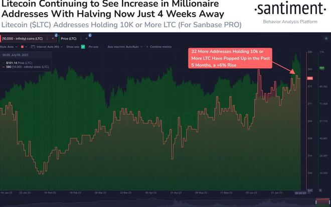 随着减半的临近,莱特币度过了忙碌的一个月。链上数据显示,近期莱特币鲸鱼总数有所增加,距离莱特币减半仅剩一个月时间。链上分析公司Santiment 的数据显示,LTC“百万富翁”地址的数量大幅增加。