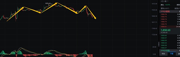 姨太1H的结构,姨太的走势直接走了一个头肩顶的走势,昨天就说了1950的位置,整体的话姨太表现的非常的差,既然表现的差的话那么就没有必要去参与,姨太这里还得继续往下寻找支撑预期得去1800附近找支撑了。