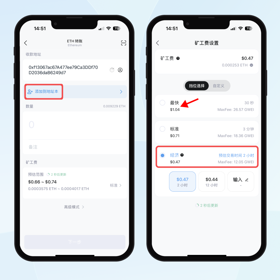 此外,为了协助用户在交易确认时间和费用之间实现最佳平衡,imToken 新增「经济」挡选项。在「经济」挡中,我们提供了「轻微节省」和「中度节省」两种矿工费设定可供用户选择,同时还提供了手动输入希望支付矿工费的方式,用户可以根据自己的需求和偏好灵活调整矿工费。