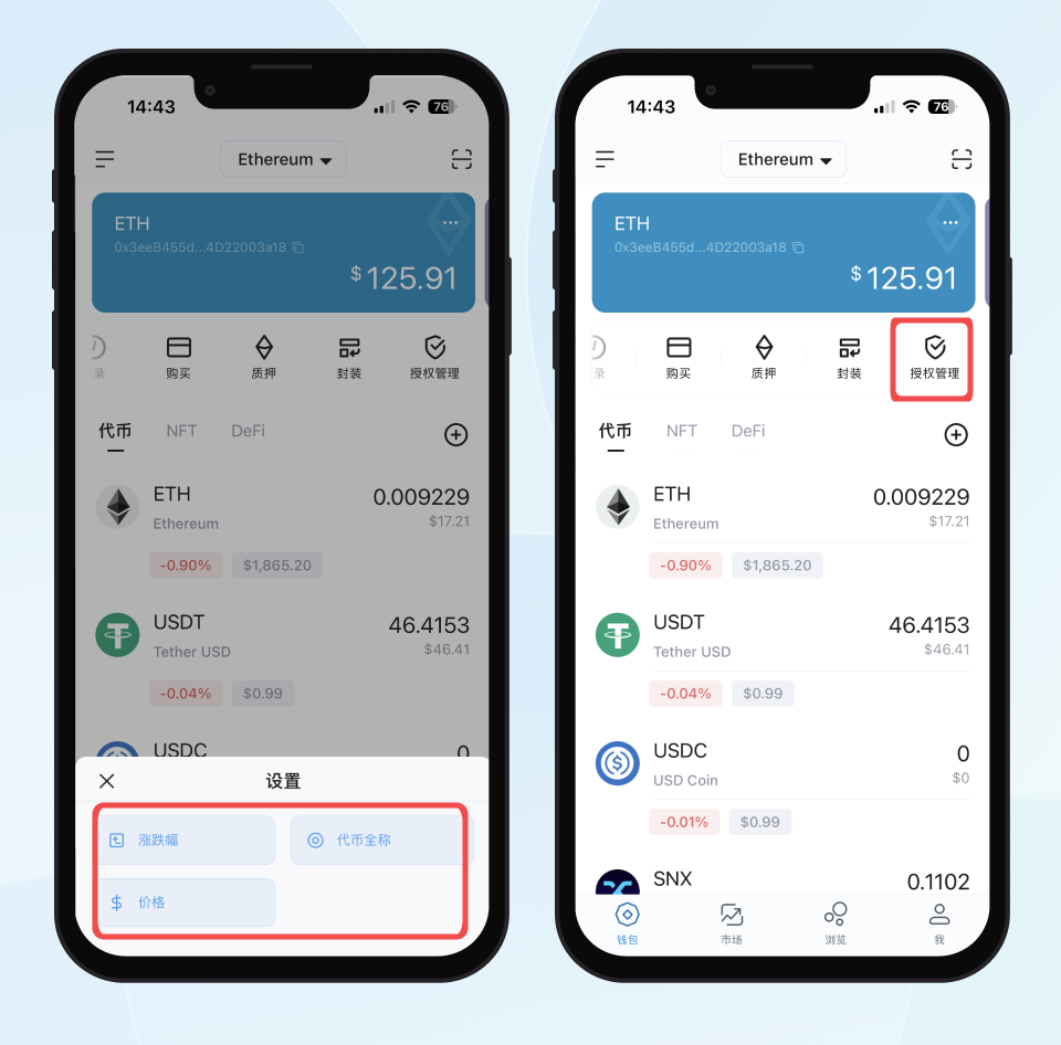 为了让用户能够快速掌握持有资产的最新信息,此次更新 imToken 优化了首屏展示界面,新增代币单价、涨跌幅和代币名称的展示。此外,为了更加个性化的体验,用户也可以根据自己的需求和偏好,轻松开启或关闭这些信息的展示。