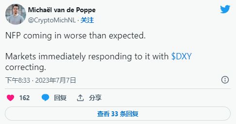 虽然美元指数 (DXY) 跌破 102.75,这表明加密货币市场将会上涨,比特币可能会重回 3.1 万美元以上,但紧张的劳动力市场对经济不利。此外,就业岗位的创造是积极的,但 28% 的新增就业岗位依赖于政府,这表明私营部门缺乏强劲的增长。此前强劲的 ADP 就业数据显示 6 月份新增就业岗位 497,000 个。