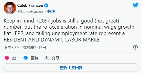 美国劳工统计局7月7日公布了6月份非农就业人数(NFP)和失业率数据。6 月份 NFP 为 20.9 万,低于市场预测的 22.5 万。这是自 2020 年 12 月以来的最低读数,但仍是跟上劳动年龄人口增长所需的每月 7 万至 10 万人口的两倍多。上个月非农就业人数为 30.6 万。