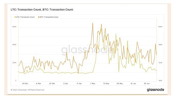 值得注意的是,根据 Glassnode 的数据,LTC 的总交易量在 6 月份大幅增加,在某些情况下达到了与比特币每日交易量相当的水平。