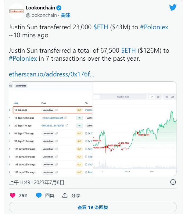 今天,TRON 的创始人将价值 4300 万美元的约 23K ETH 转移到了 Poloniex。