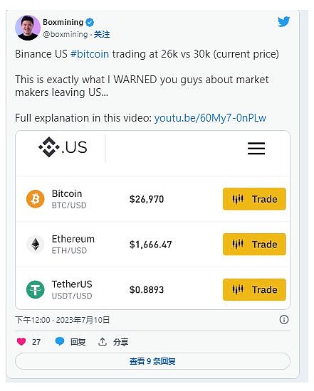 据报道,比特币在 Binance US 上的交易价值为 26,970 美元,而全球现行市场价值为 30,188 美元。Michael Gu指出了这一惊人的差异,他是加密货币领域的知名人物,也是以加密货币为中心的 YouTube 频道 Boxmining 的代言人。