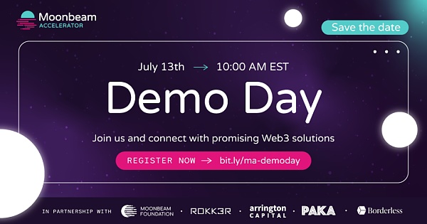 本次孵化加速计划的Demo Day将于7月13日10:00 pm(UTC+8)在线上举行,所有参与的团队将在活动当天展示成果,除此之外,还会有很多知名的投资者和VC将加入。Demo Day对于Moonbeam Accelerator孵化计划来说是一个非常大的里程碑,欢迎所有感兴趣的小伙伴前来参与!