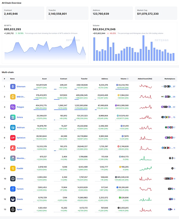 截至 2023 年 7 月 10 日,NFTScan 目前已支持 Bitcoin、Ethereum、BNBChain、Polygon、Solana、Avalanche、Arbitrum、Optimism、Aptos、Fantom、Moonbeam、PlatON、Cronos、Gnosis 14 条主流区块链网络共产生: